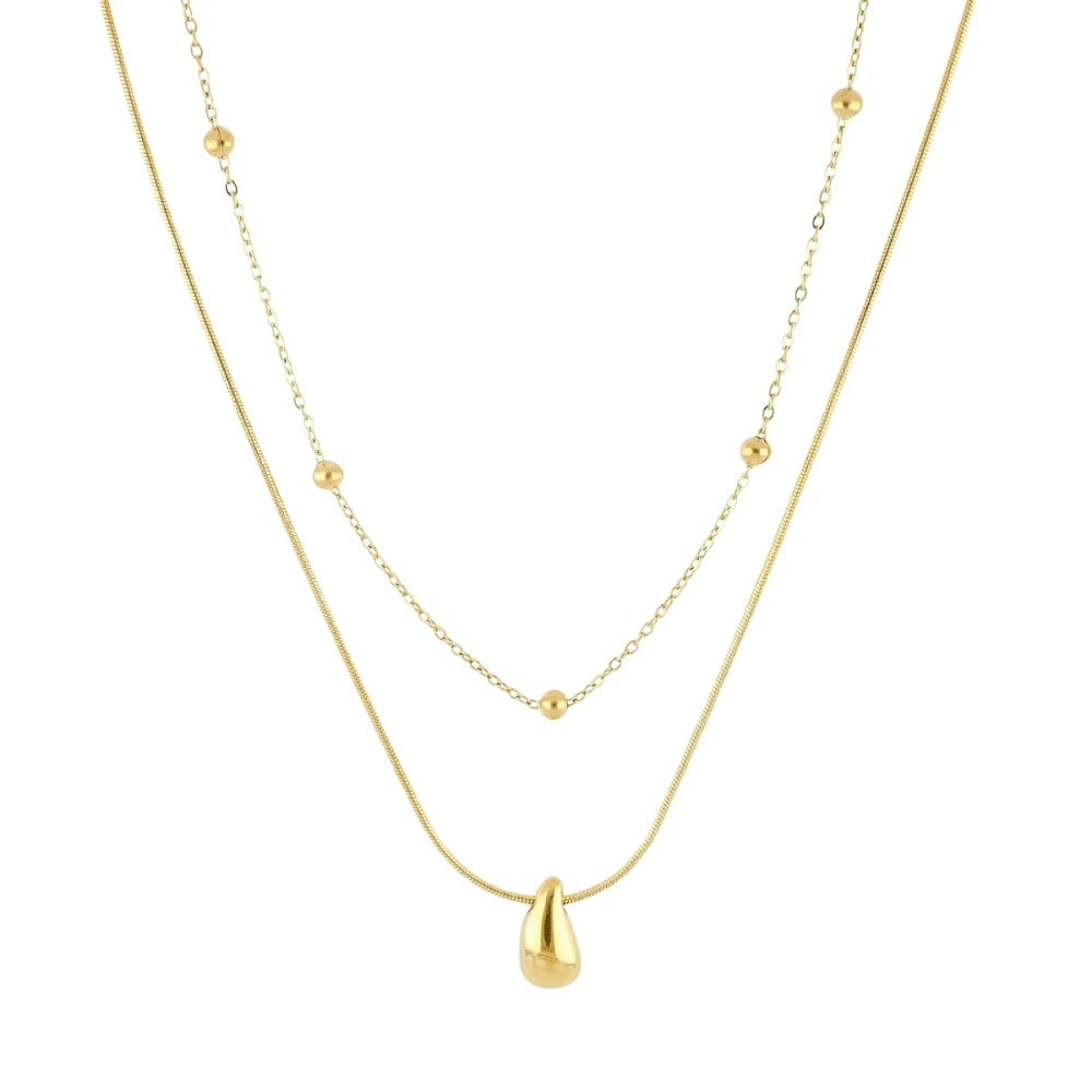 El collar Bogo combina dos cadenas delicadas: una con pequeñas bolitas y otra con un colgante en forma de gota. 💧